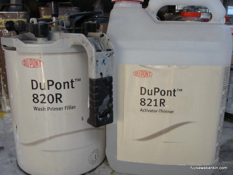 パネル表面の電着プライマーは非常に薄い(20ミクロン前後)のでプライマーサフェーサーの足付けの為にダブルアクションサンダーP320番にて研磨すると端部やプレスライン部などは面圧が高くなるためすぐに素地(鉄板)が露出してしまいます。どうせプライマーサフェーサーを塗るのだからあまり関係のないように思えるかも知れませんがプライマーサフェーサーは純粋なプライマーに比べると防錆性能は10分の1程しかありませんので当店ではあえて単体でプライマーを使用します。デュポンの820Rは2液型防錆専用塗料で、非常に優れた防錆能力を持つ「ウォッシュプライマー」です。右の写真は新品パネル研磨の際に鉄板がむき出しになった箇所にウォッシュプライマーを塗布しているところです。その後2液型サフェーサーをパネル全体に塗布します。